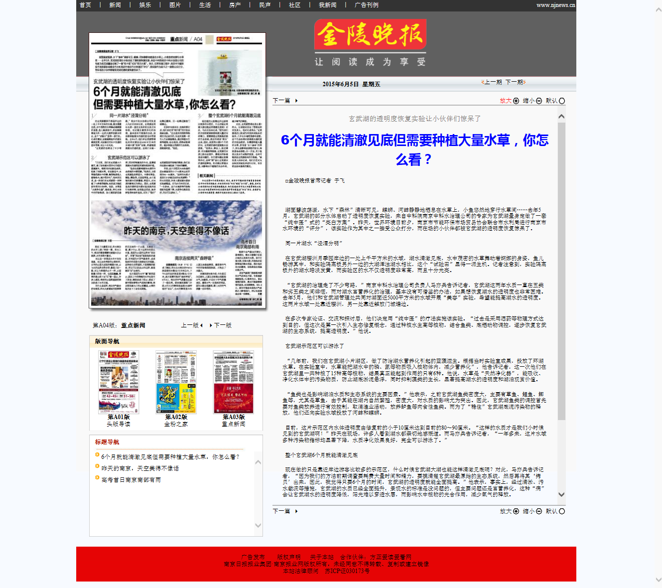 中國環(huán)保新聞網(wǎng)綠色南京頻道對中科水治理采取的純生態(tài)治水法表示贊揚,認(rèn)為應(yīng)該推廣應(yīng)用,并對水體透明度、水質(zhì)治理效果給與積極肯定。