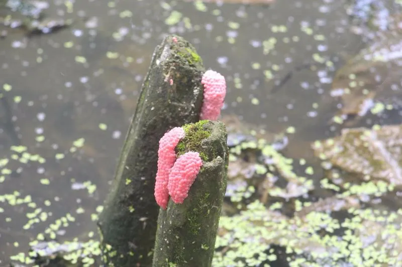 蕪雜的環(huán)境又滋生了大量的蚊蟲和具有血吸蟲病傳染危害的釘螺,水體散發(fā)出陣陣難聞的異味,讓人敬而遠(yuǎn)之。如果稍稍觀察水岸邊,還會發(fā)現(xiàn)石塊和植物枝葉上有一團(tuán)團(tuán)紅色的異物,那是福壽螺產(chǎn)的卵,一種對環(huán)境產(chǎn)生很大破壞的入侵物種,它們不僅貪婪啃食周圍各種植物,還會因攜帶寄生蟲(如廣州管圓病蟲等)而傳播疾病,導(dǎo)致這一區(qū)域的水體生態(tài)環(huán)境進(jìn)一步失衡,淪為一片死氣沉沉的臭水塘,嚴(yán)重影響了黑龍灘區(qū)域整體的水生態(tài)健康。