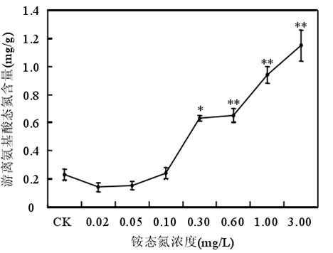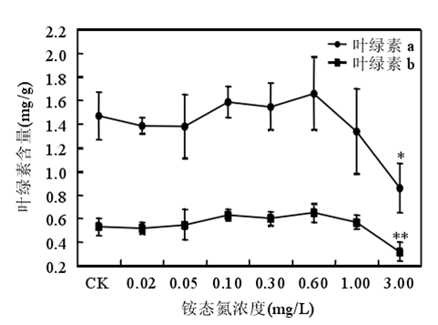 銨態(tài)氮濃度低于 0.60mg/時(shí)苦草生長良好,濃度大于或等于 1.00mg/L 時(shí)苦草的光合能力受到抑制、代謝受到干擾??嗖輰?duì)銨態(tài)氮最敏感的生理生化指標(biāo)是葉片中游離氨基酸態(tài)氮含量。銨態(tài)氮作為沉水植物的一種營養(yǎng)物質(zhì),當(dāng)其含量較低時(shí),植物由于營養(yǎng)缺乏誘導(dǎo)產(chǎn)生自由基。